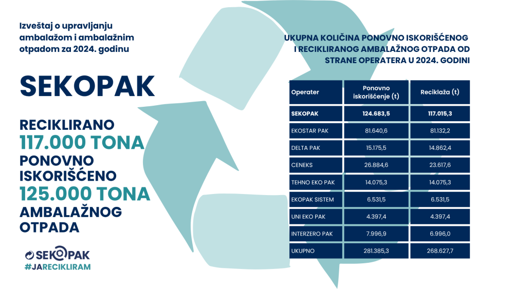 Sekopak je i ove godine dao značajan doprinos ukupnim rezultatima – ponovo je iskorišćeno oko 125.000 tona, dok je na reciklažu upućeno više od 117.000 tona ambalažnog otpada. Time su ostvareni rezultati od 68,7% za ponovno iskorišćenje i 64,5% za reciklažu, uz efikasno funkcionisanje sistema kroz saradnju sa privredom, komunalnim sektorom i partnerima u reciklažnom lancu.